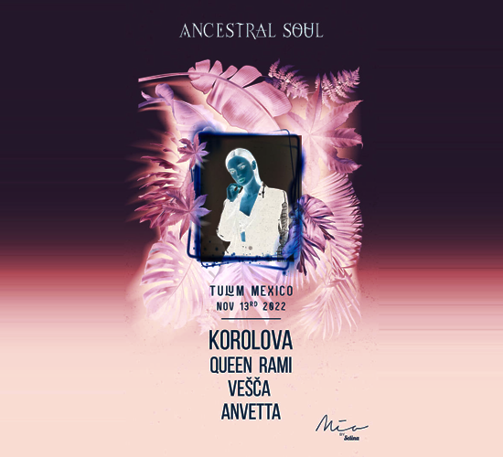 Ancestral Soul in Mia Beach Club Tulum presents KOROLOVA, Queen Rami, Vesca, and Anvetta.